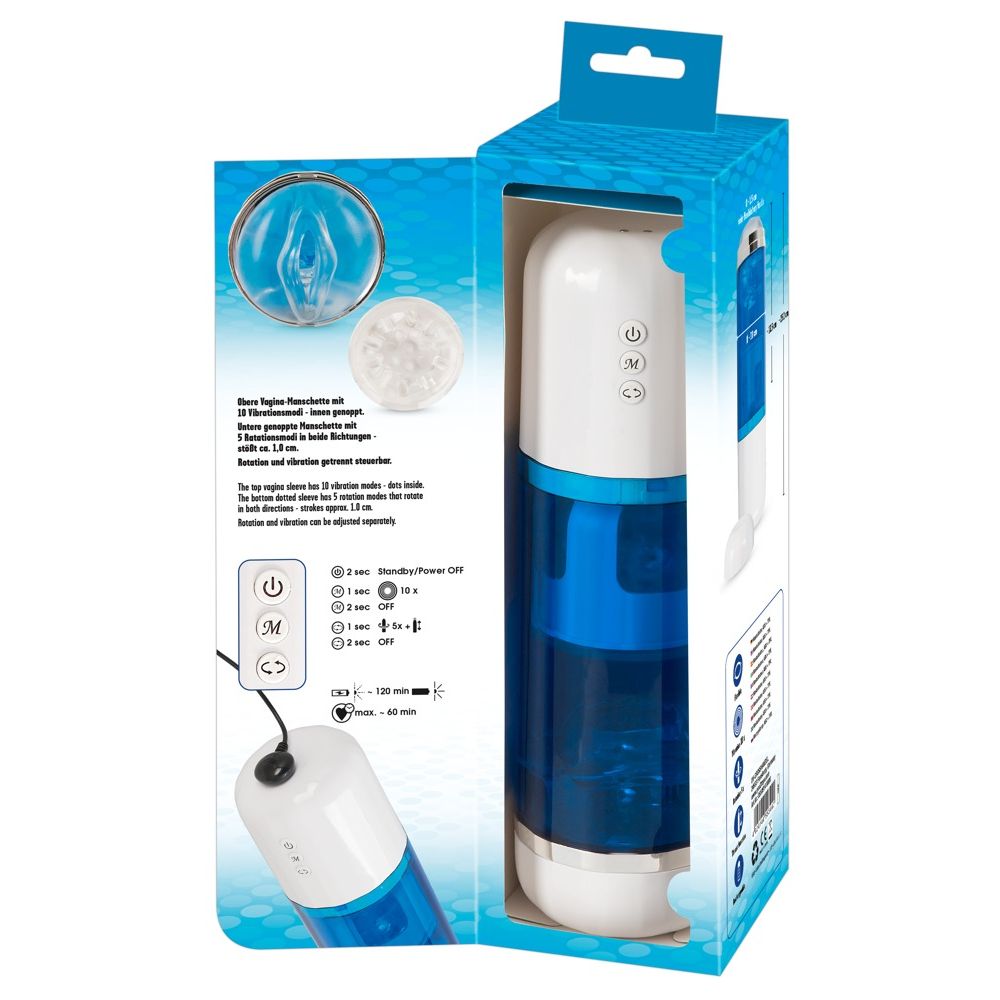 Перезаряжаемый 3-функциональный мастурбатор, сочетающий вращение и засасывание в нижней части и вибрацию в верхней. Ствол пениса интенсивно массируется, а кончик пениса одновременно стимулируется вибрацией. 10 режимов вибрации и 5 режимов вращения в обоих направлениях, а также функция всасывания на 1 см обеспечивают приятное разнообразие, удобно управляются по отдельности нажатием кнопки прямо на игрушке. Две внутренние втулки оснащены бесчисленными мягкими массажными точками и могут быть сняты для легкой очистки. Мастурбатор в виде вагины удобно хранить с помощью прилагаемого защитной крышечки. USB-кабель для зарядки входит в комплект. Рабочая длина - 13,5 см.