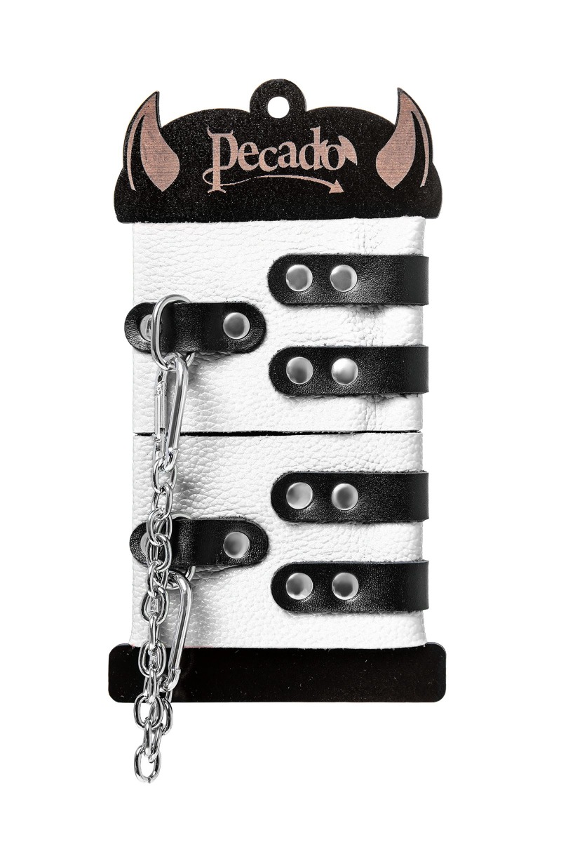 Мягкие оковы с двумя жёсткими ремешками от Pecado помогут обездвижить партнера во время сексуальных прелюдий или жестких БДСМ-играх. Оковы изготовлены полностью из белой, натуральной кожи. Ремешки выполнены из чёрной жёсткой кожи, украшены люверсами. Выделка материала произведена вручную. Ремешки и широкая манжета хорошо держат форму: не тянутся и не мнутся. Качественная металлическая фурнитура добавляет лоска изделию, а аромат натуральной кожи повышает градус возбуждения. Благодаря широкому запасу регулировок, можно подобрать необходимый обхват. Аксессуар удобно застегивать и легко расстегивать. При правильном использовании не оставляет следов на теле и не доставляет дискомфорта. Манжеты оков соединяются между собой помощью двух карабинов и съемной стальной цепочки. Подходит и для женских, и для мужских ног. Длина манжет - 25 см, ширина - 7 см. Длина сцепки - 20 см.
