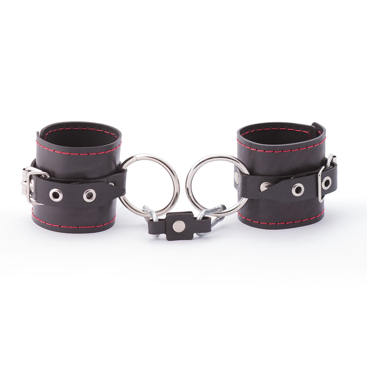 Наручники состоят из одного слоя натуральной кожи, одного ремешка и стального кольца. По краям прошиты декоративной строчкой красного цвета. В комплекте соединительный элемент из кожи с двумя карабинами. Универсальные, подойдут и для использования в любовных играх, и в качестве аксессуара для дополнения образа. Общая длина - 28 см. Длина манжеты - 18,5 см, ширина - 7 см. Обхват - 19-27 см.