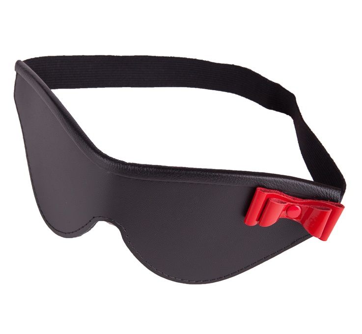 Маска на глаза закрытого типа из натуральной кожи черного цвета, украшенная красным лаковым бантом. Фиксирующая резинка позволяет легко регулировать размер изделия. Внутренняя часть имеет подкладку из велюровой бархатистой кожи. Ширина - 7 см.