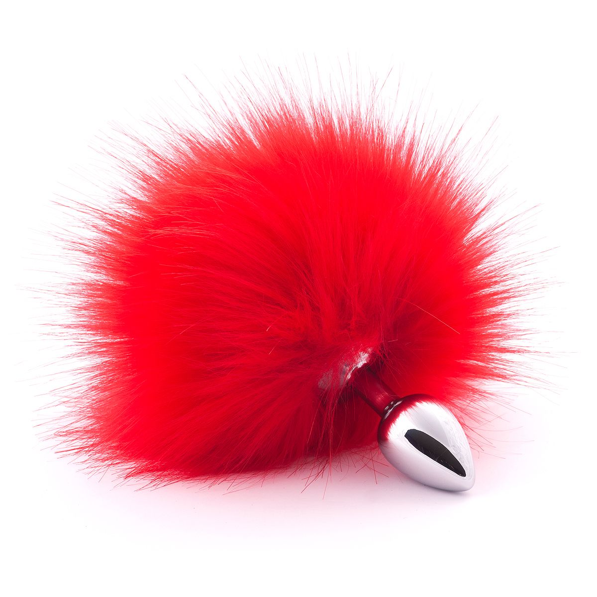 Серебристая анальная пробка с красным хвостиком. Искусственный эко-мех. Диаметр хвоста — 15 см.